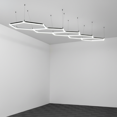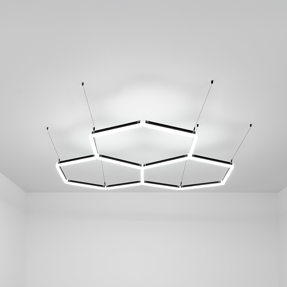 A luminária de garagem TYRI BLACK LED é um modelo moderno com três seções hexagonais, composta por 15 pequenos tubos de 0,44 m e 13 conectores, que proporcionam uma luz branca brilhante de 13.200 lúmens. A luminária TYRI mede 1,65 x 1,63 metros. Sua construção em policarbonato e alumínio a torna muito leve, com apenas 1,75 kg. A instalação é simples: pode ser montada diretamente na parede ou no teto, ou suspensa utilizando parafusos e buchas ou os 8 cabos de suspensão ajustáveis não incluídos.