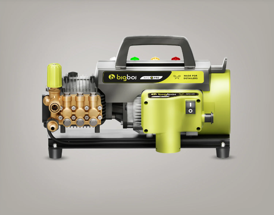 O BigBoi WashR PRO vem com tecnologia de indução sem escova, fazendo com que dure 4 vezes mais do que a sua lavadora convencional. Graças à cabeça de bomba de latão Triplex de design italiano com motor de 4 pólos, a lavadora de pressão WashR Pro oferece 1450 RPM com alto torque. Isso a torna uma das unidades mais silenciosas com menos de 80dB! Ele fornece uma pressão máxima de 130 bar (1850PSI) e um fluxo de água de 9,5LPM (litros por minuto). Simplesmente a melhor lavadora de alta pressão para limpar seu carro!